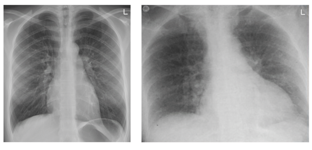 πWe can see below a standard chest xray on the left and on the right, we can observe the effects of shape distortion that has caused our anatomy to seem wider than in reality: