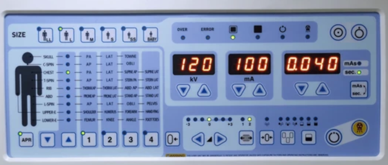 Here’s an example of a control panel, showing the values for a standard chest xray. A good range for a chest would be from 80-140 kVp to penetrate the body and a low mAs, from 1-12 mAs.