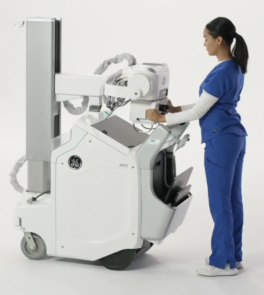 The machine itself is a powered x-ray device, designed for flexibility and portability. They’re equipped with a control panel, an X-ray tube, and a detector (either computed radiography (CR) cassettes or digital radiography (DR) flat panel detectors).